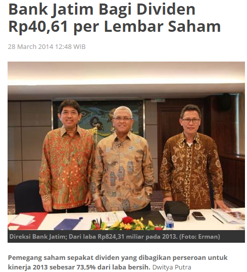Selepas pertengahan Nopember, BJTM segera bangkit dari tidur panjang. Harga saat 15 Nopember 2014 berada di angka Rp. 413. Nah, berapa harga saat April Mop ? Rp.559 / lembar. Wow !! angka segini belum lagi devidennya, Bro. Berapa deviden mau dibagi ? kabarnya 40 % dari keuntungan !!